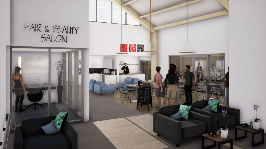 The development also includes a reception area, a Hair and Beauty salon and a Café, where it is envisaged that the public and residents can mix and will have access to light eats or a cup of tea or coffee. (See Figure 2) Also included are a cinema room and a large communal lounge.