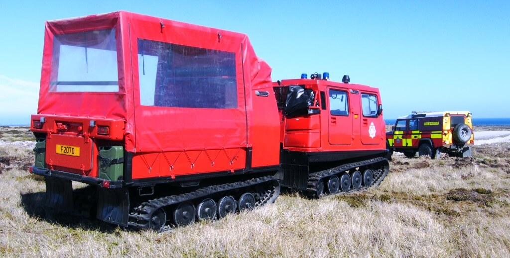 Another fairly recent addition to FIFRS is the Fire BV. She is an all terrained tracked vehicle capable of carrying personnel and equipment across the difficult terrain of the Falklands with ease and speed. The Falklands is a combination of boggy terrain with stone runs and rocky inclines. The Fire BV makes easy work of all terrains and is very useful for equipment supply for wild fires and search and rescue operations.