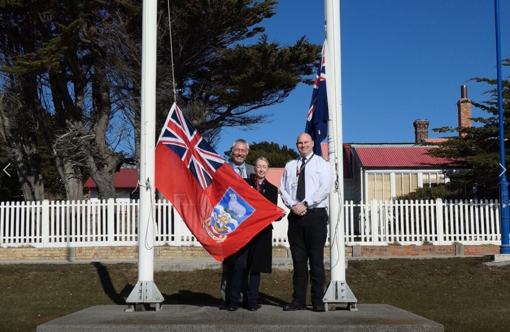 The Red Ensign flag alongside the Falklands Islands flag will be flown on Victory Green, show our continued support for the hardworking men and women at sea. The Governor of the Falkland Islands, Alison Blake, and the Chief Executive, Andy Keeling, joined the Deputy Harbour Master, Steuart Barlow, in hoisting the flags.