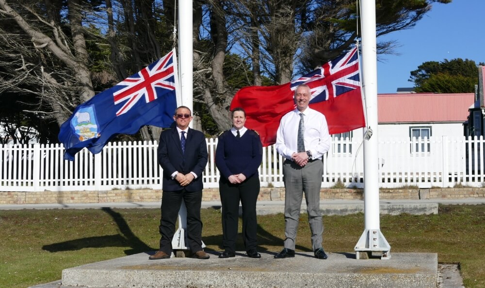 The Deputy Governor of the Falkland Islands, Dave Morgan, and the Chief Executive Officer of the Falkland Islands Government, Andy Keeling, joined the Harbour Master, Captain Jo Cox, in hoisting the flags.