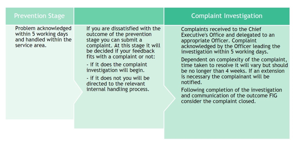 You will be encouraged to complete the Comments, Compliments and Complaints Feedback Form or the webform on the FIG website; this is to ensure that relevant details are recorded. It is easier to resolve complaints at the prevention stage, directly to the service area concerned; please talk to a member of our staff at the department you are complaining about. Then they can try to resolve any problems on the spot.