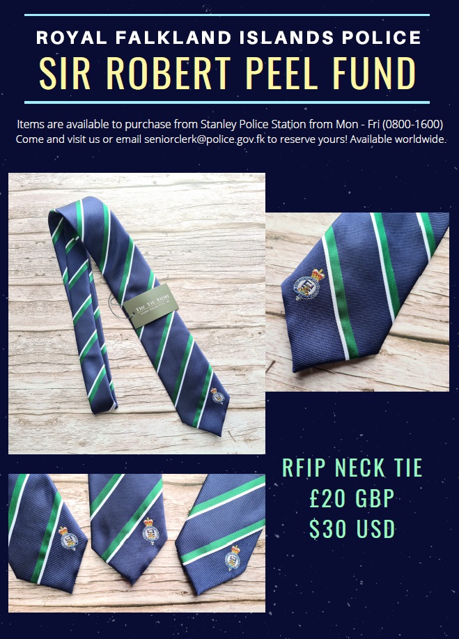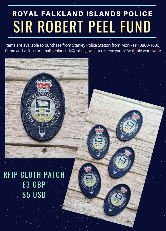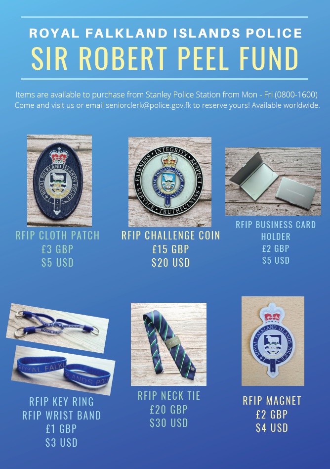 Items in support of the Sir Robert Peel Fund are available to purchase from Stanley Police Station, Monday to Friday (0800 – 1600).