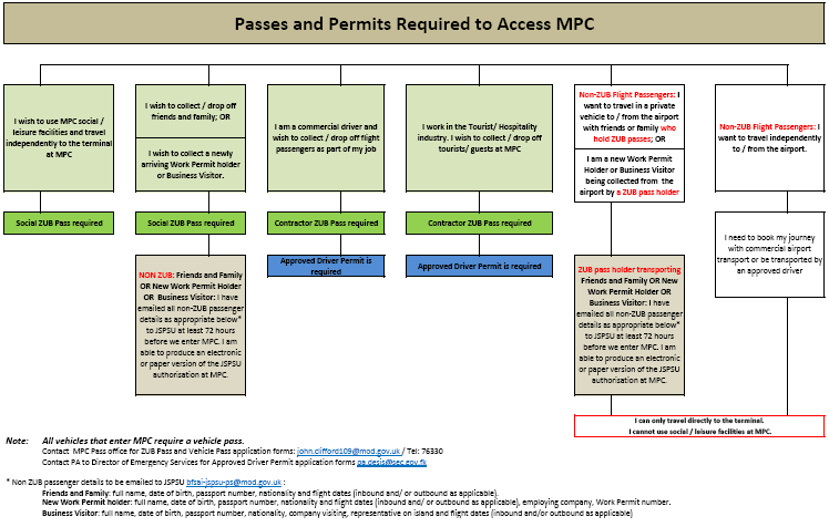 You may contact the Passes & Permits Office at Mount Pleasant Complex (MPC) on telephone +500 76330 for more information and/or other inquiries.